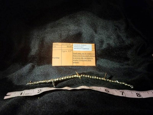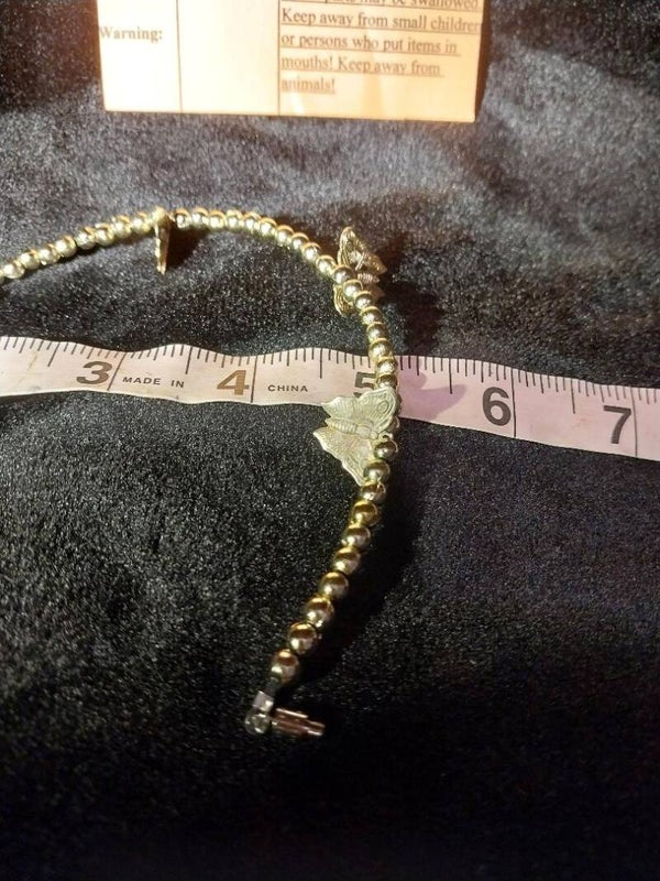 Gold beads, 2 gold-colored butterflies, 1 silver-colored butterfly. Approximately 8.5".